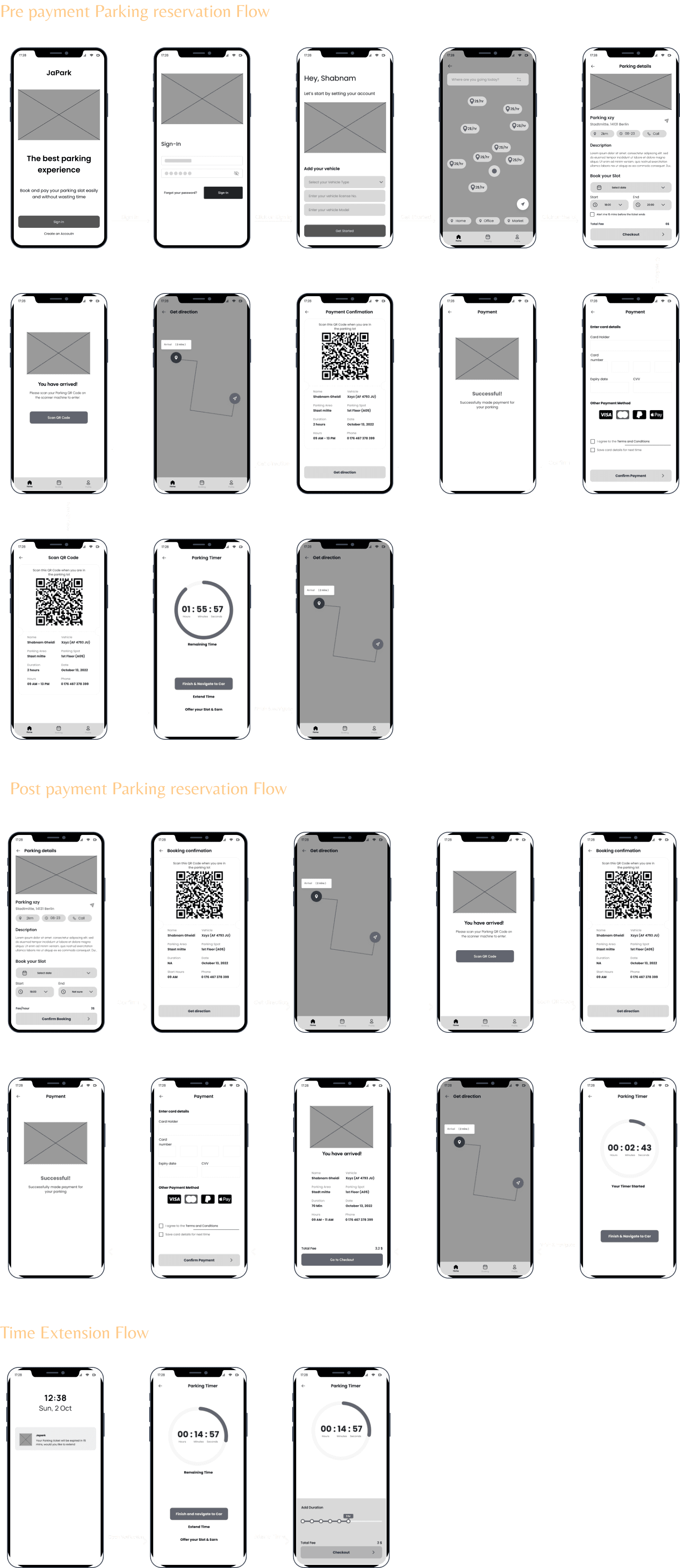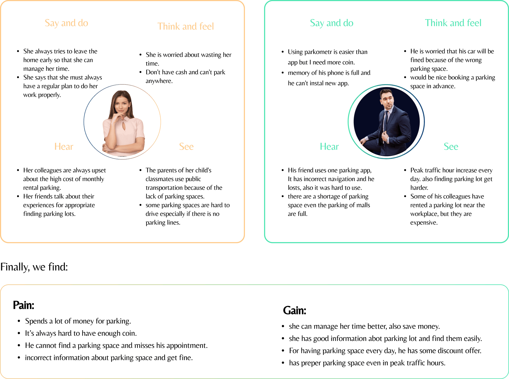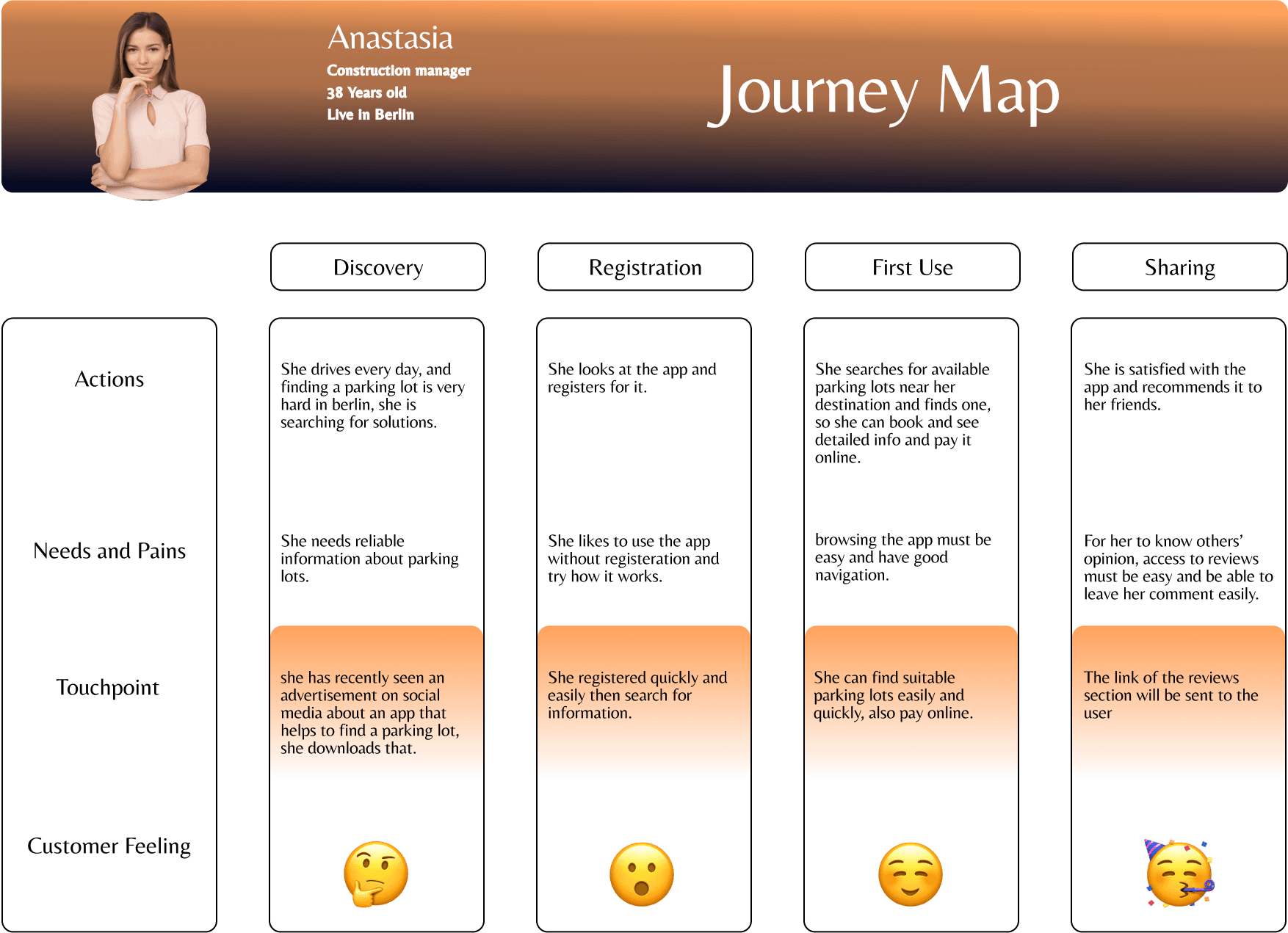 We developed a customer journey map based on user research to better understand the key actions, needs, painspoints, and overall journeys that users may have to find a parking locations.